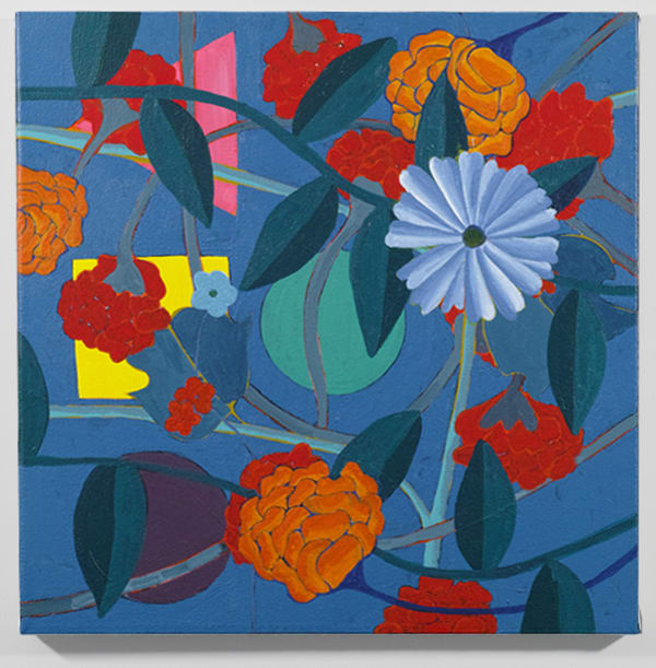 This exhibition by Pamela Fraser connects two new bodies of work that are a departure from the spare abstract paintings the artist made for many years. The two bodies of work are connected by their lyricism, fullness, and dynamic, affective color. Inspired by the textile designs of mid-century architect and designer Josef Frank, the chaotic botanical imagery of the paintings explores color and diverse modes of visual description. Each painting catalogs different ways that flowers can be described visually, based on both observation and/or imagination. Fraser’s longstanding interest in abstraction has migrated into small, intensely-hued geometric-designed ceramic vessels that also explore color relationships, and expands the artist’s practice into design.
