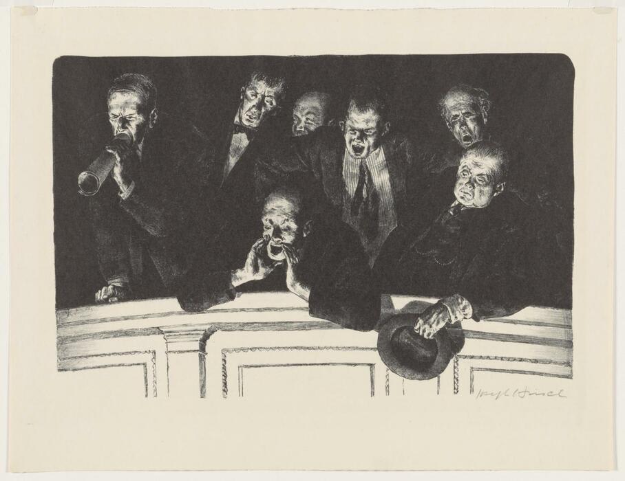 In this print, the artist shows a group of older, white men dressed in suits, shouting from their balcony seats.