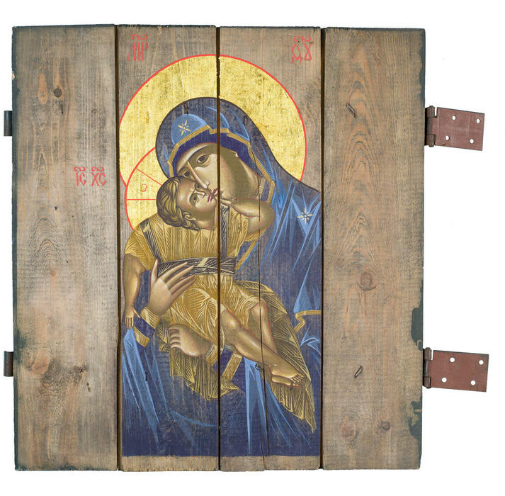 Image: Sofia Atlantova and Oleksandr Klymenko, Our Lady with the Child, 2018, Ammunition box fragment, tempera, and gold leaf.