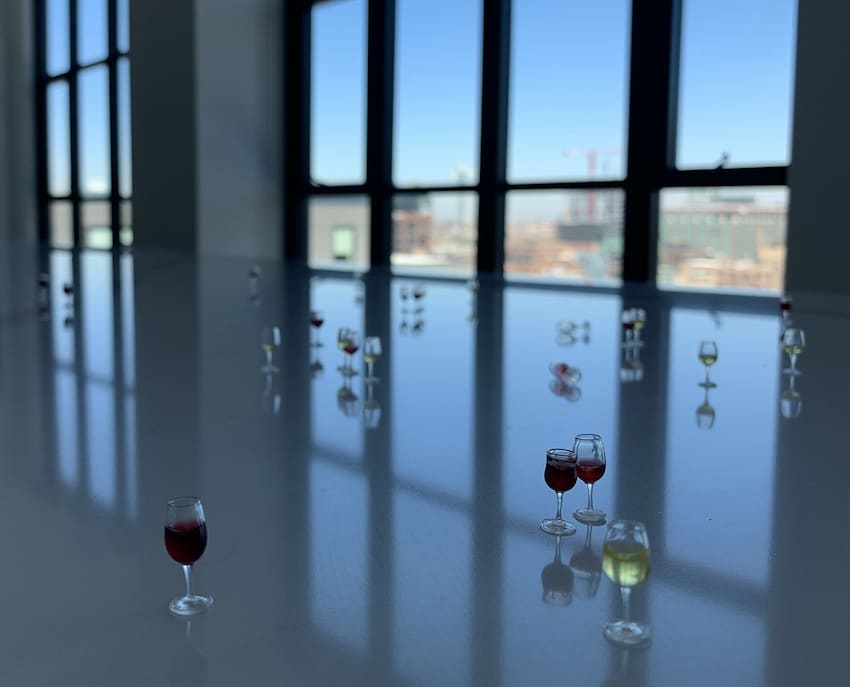Image: Amanda Ross-Ho, Untitled Opening (NOIR AND BLANC), 2014, thirty-five 1:12 scale glass wine glasses, pigmented resing, dimensions variable