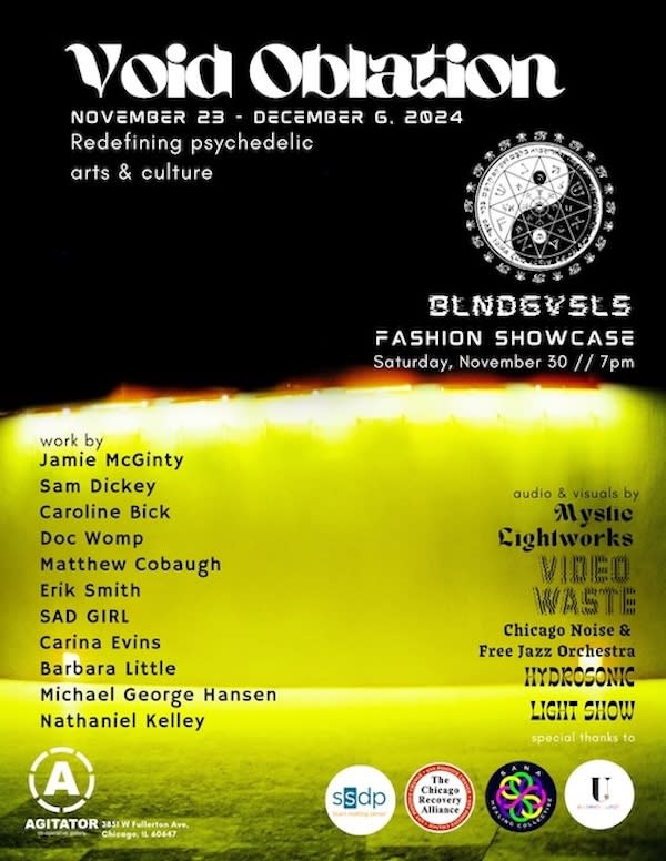 Friday December 6 - Closing reception featuring a psychedelic stories open mic, a harm reduction panel discussion with voices from several leaders in the community, and a letter writing campaign in support of the Illinois CURE Act (IL HB0001).