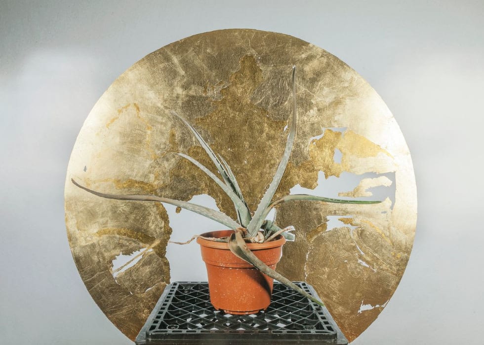 Interested in how the Divine is embodied through light, Forrester references the golden halo common to religious iconography as a means to elevate the ordinary and often neglected. Forrester’s gilded portraits of everyday houseplants call into question our human relationship to nature and spirituality, as well as histories of colonization and capitalism.