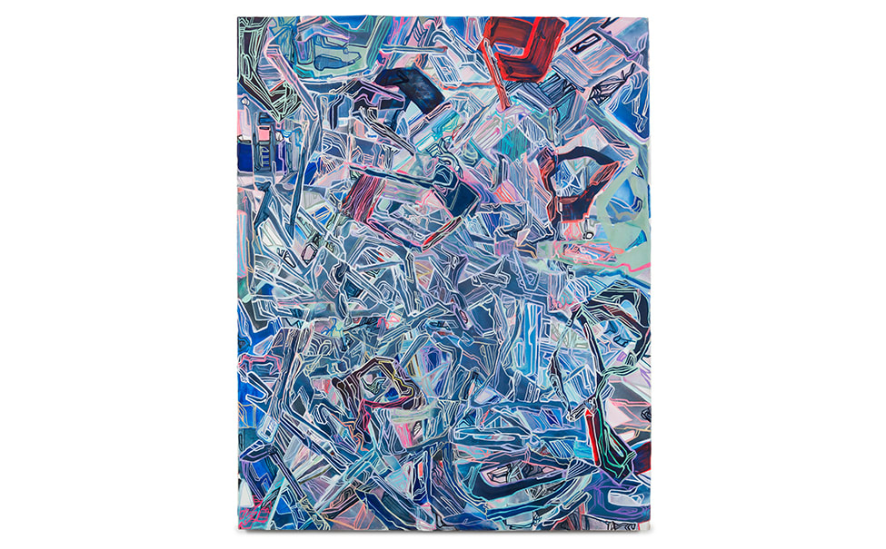 Wirsum’s latest body of work attempts to refine the visual noise that has accumulated in his past painting practice. The seemingly obsessive linear layering and intense attention to detail along with vivid coloring remains, but restful passages of negative space are being incorporated to establish a compositional hierarchy and moments of ease. These latest paintings still emphasize a high variety of texture and breadth of spectrum with the continued playful push and pull of abstraction and figure, but as the practice advances the need for stillness pushes the process into new directions of exploration in A Stranger Still…