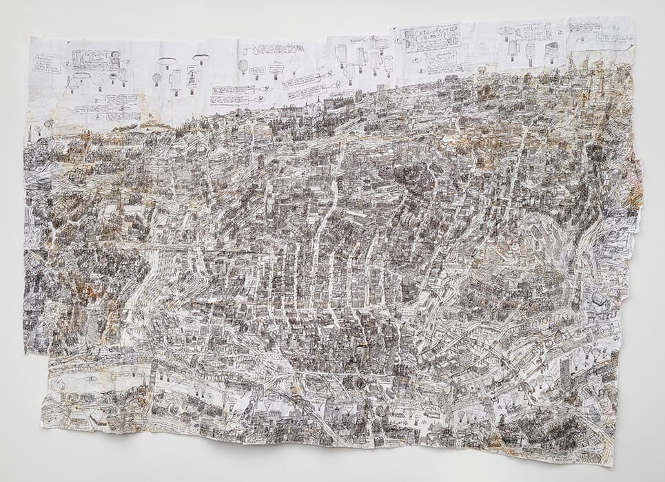 Image: Courttney Cooper, Cincinnati Map, 2018. Ink on collaged bond paper, 72h x 93w in.